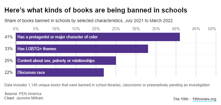 In a typical year, PEN America, a nonprofit that advocates for free expression, receives a handful of reports related to book banning. That changed dramatically over a nine-month period from 2021 to 2022, when the organization identified 1,586 cases of book banning concerning 1,145 unique titles by 874 authors. Of the banned books, 41 percent contain protagonists or other major characters of color, 22 percent of the books discuss race, 33 percent have LGBTQ+ themes and 25 percent feature content about sex, puberty or relationships.