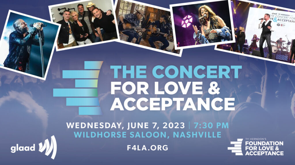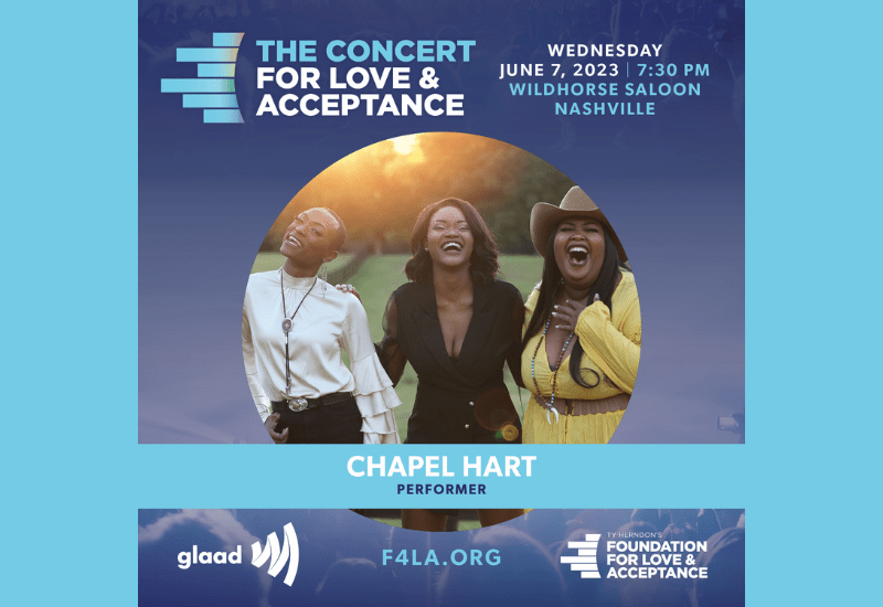 GLAAD, the world’s largest LGBTQ media advocacy organization, and groundbreaking country music artist Ty Herndon announced new names to the performance lineup the Concert For Love & Acceptance, set to take place Wednesday, June 7, 2023, at Wildhorse Saloon in Nashville on the eve of CMA Fest. Chapel Hart, Sam Williams, Jamie Floyd, Brandon Stansell, and Bryan Ruby join the previously announced Maddie & Tae, Terri Clark, Pam Tillis, Desmond Child, Wendy Moten, Billy Gilman, Shelly Fairchild, and Justin Fabus. Additional appearances and performances to be announced in the coming weeks.