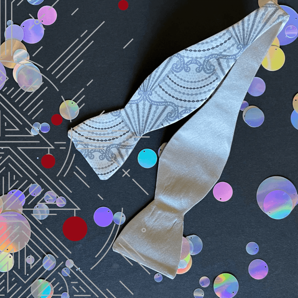 This dual-sided bow tie combines a stunning Art Deco radial pattern with the luster of silver satin. The end result is eye-catching, while still allowing the tree to steal the show.
