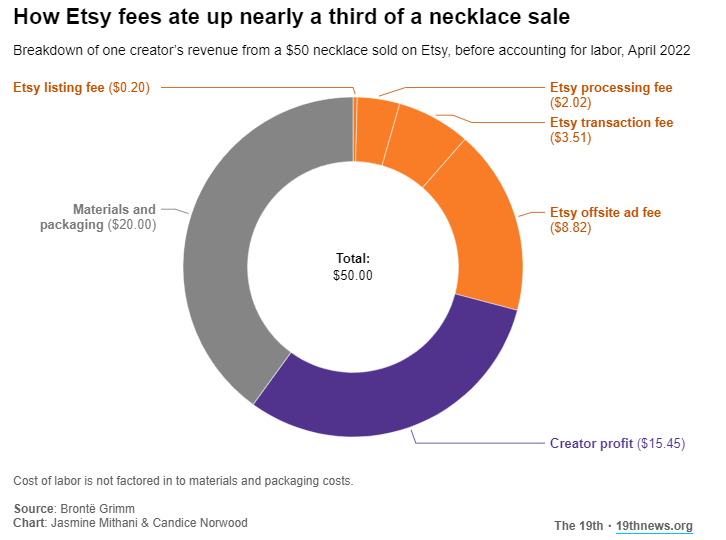Those small individual charges on Etsy sales can add up quickly. This month, Grimm sold a necklace for $50 just as the new transaction fee was being implemented. After taking out fees plus the cost of materials and production, they made $15.45 in profits, working out to an hourly pay of $3.86 for their labor. Many Etsy sellers live paycheck to paycheck, and every dollar matters for meeting their basic needs. Grimm’s girlfriend ultimately found a full-time job during the pandemic, but it does not pay a livable wage, they said. The Etsy money helps with buying groceries and toiletries.