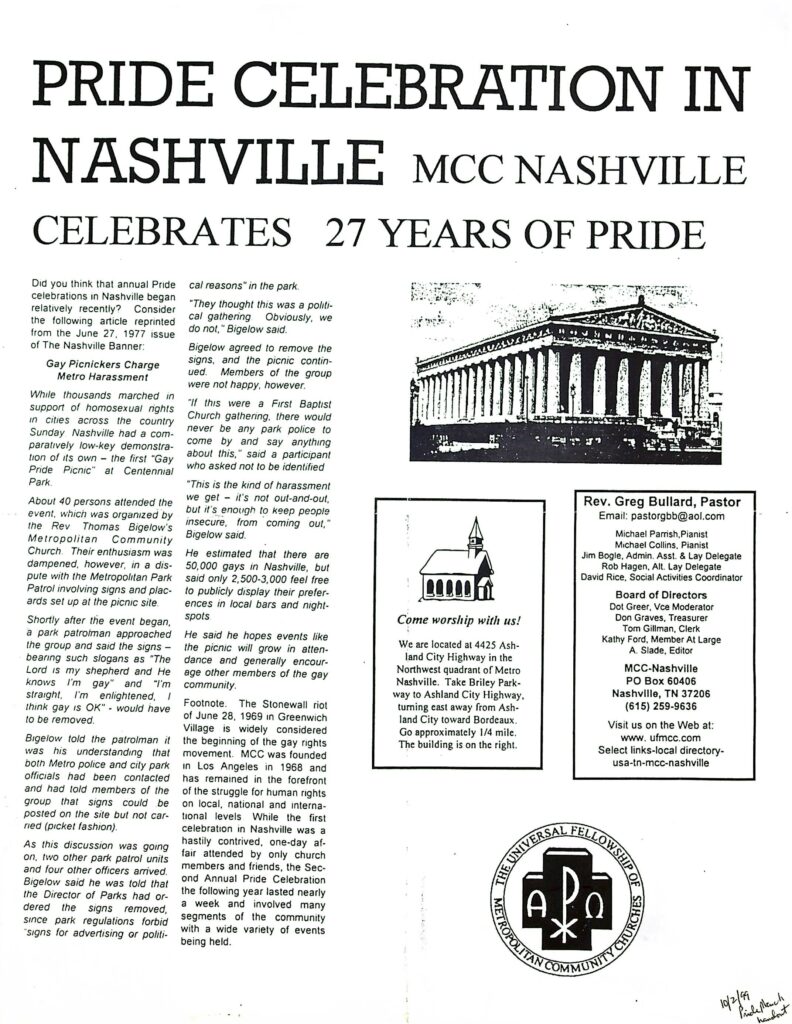 The first gay community center in our city’s history was founded in the mid-1970s and managed by the Metropolitan Community Church (MCC), a gay-affirming congregation that began in Los Angeles. But even before MCC had its own building for worship, the Edgehill Methodist Church welcomed them to use their building for services. I am not religious myself, although I grew up Roman Catholic. But I have always found the relationship between church and queer identity to be an interesting part of Middle Tennessee.