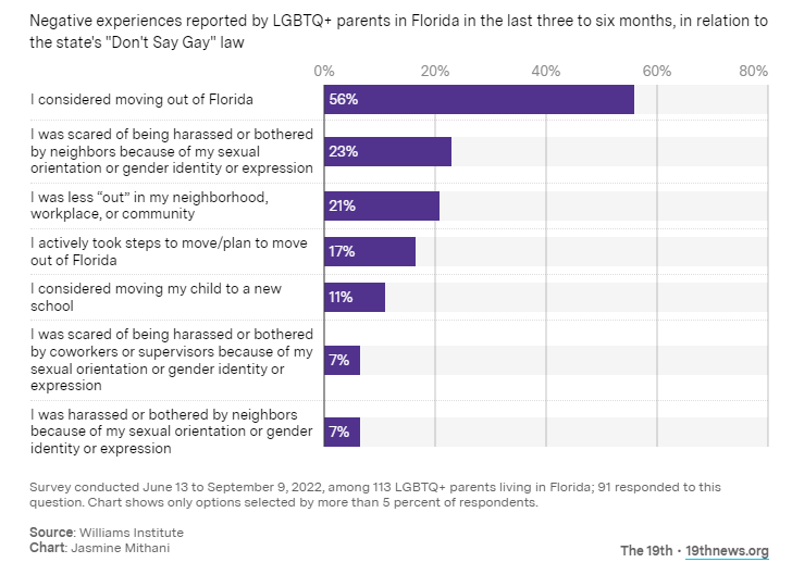 One in five parents went back in the closet in some capacity — including some who no longer hold their partner’s hand in public. More than half considered leaving Florida. Nearly nine out of 10 parents said they worried the bill would make their kids less safe.